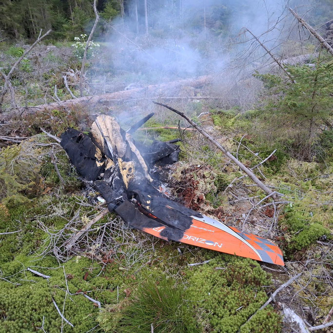 Die Feuerwehr Thalersdorf konnte die Absturzstelle entdecken und nach dem Eintreffen die Überreste und die verbliebenen Glutnester mit einem Feuerlöscher ablöschen.